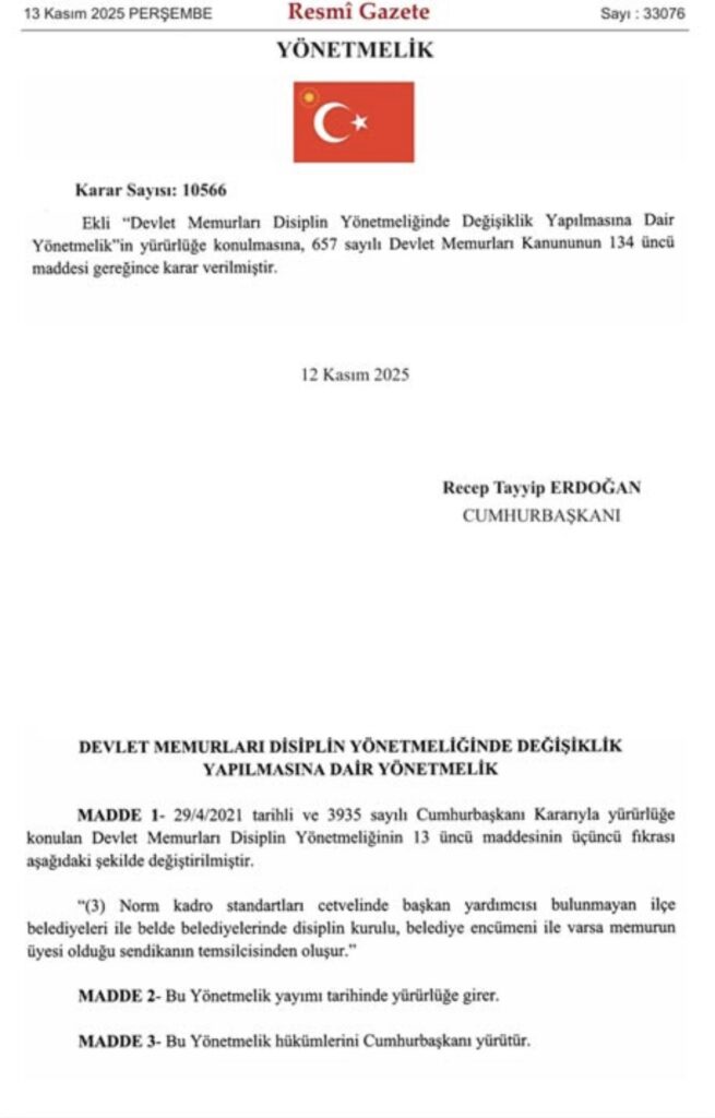 12 Kasım 2025 tarihli Resmî Gazete’de yayımlanan Cumhurbaşkanı Kararı (No: 10566)ile “Devlet Memurları Disiplin Yönetmeliğinde Değişiklik Yapılmasına Dair Yönetmelik”yürürlüğe girdi. Yeni düzenleme, özellikle belediyelerdeki disiplin süreçlerinde önemli değişiklikler getiriyor.
