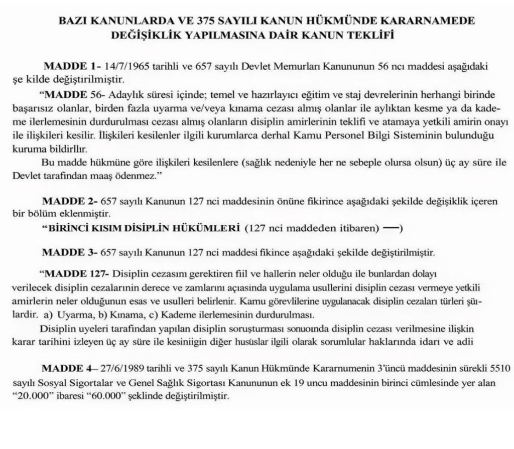 Öte yandan teklif, bazı kanunlarda ve 375 sayılı Kanun Hükmünde Kararname’de de değişiklikler öngörüyor. Devlet Memurları Kanunu’nun 56’ncı maddesi adaylık sürecine ilişkin hükümler doğrultusunda yeniden düzenlenirken, 127’nci maddede disiplin cezalarının uygulanmasına ilişkin ek hükümler getiriliyor.